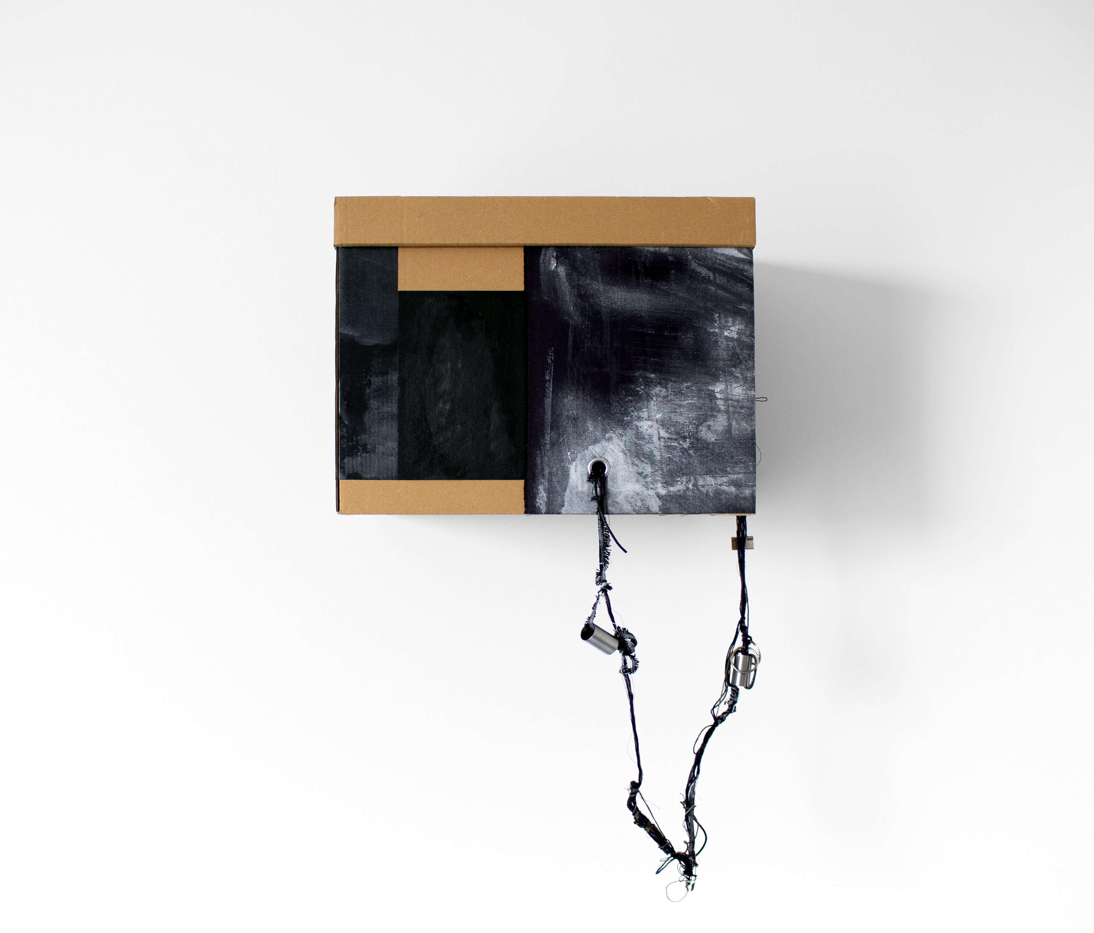 thread, eyelets, found objects and cardboard box