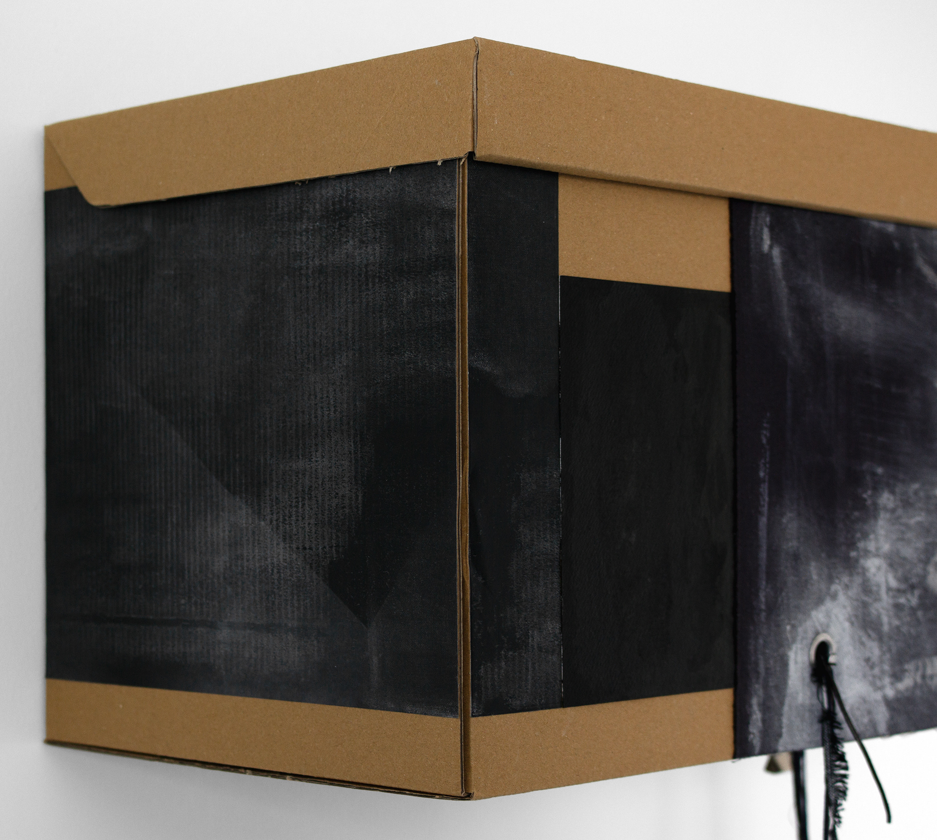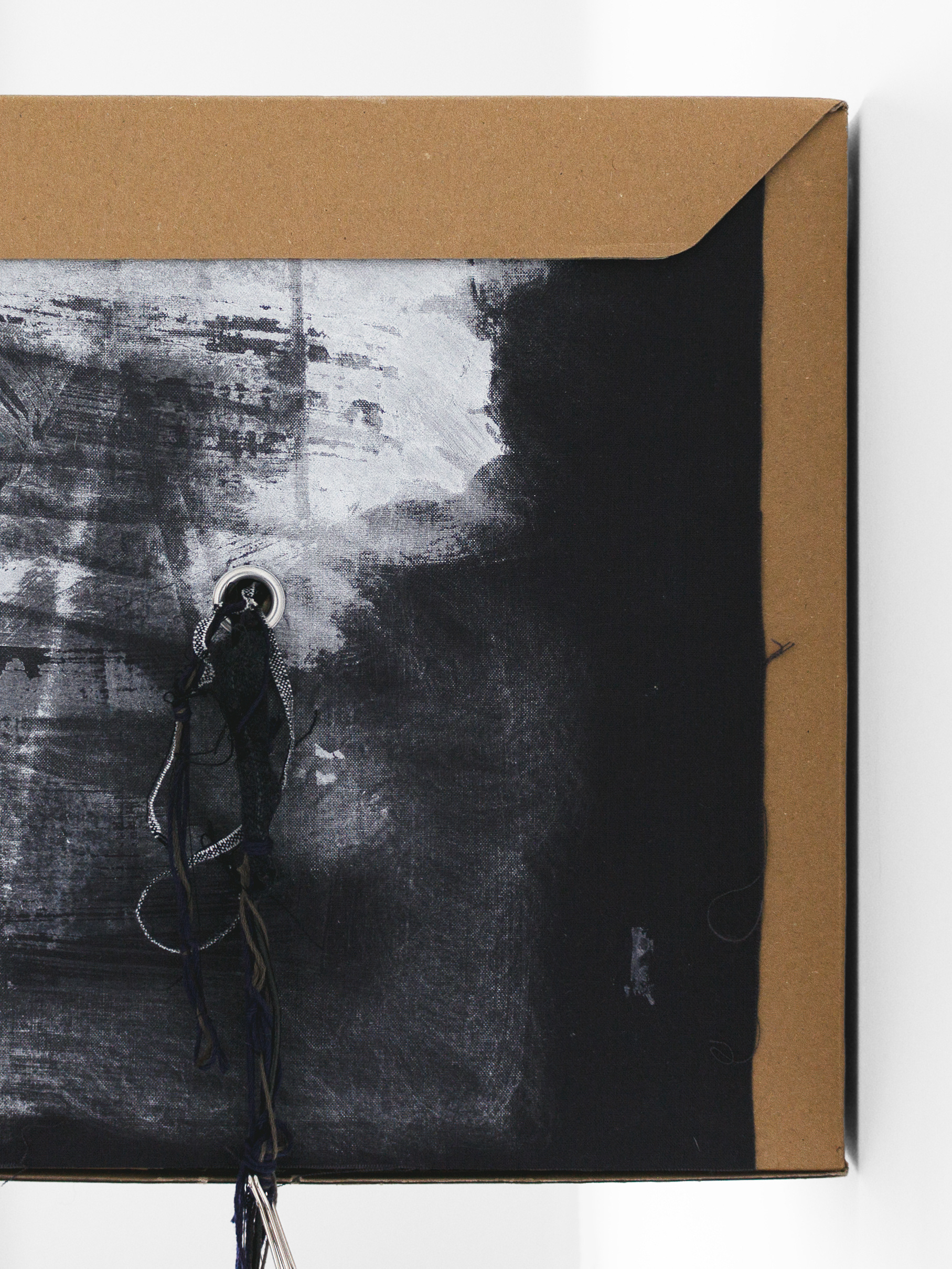 Gouache on card, laser print, solvent transfer print and ink on cotton, embroidery thread, fabric, eyelets, found objects, cardboard box
